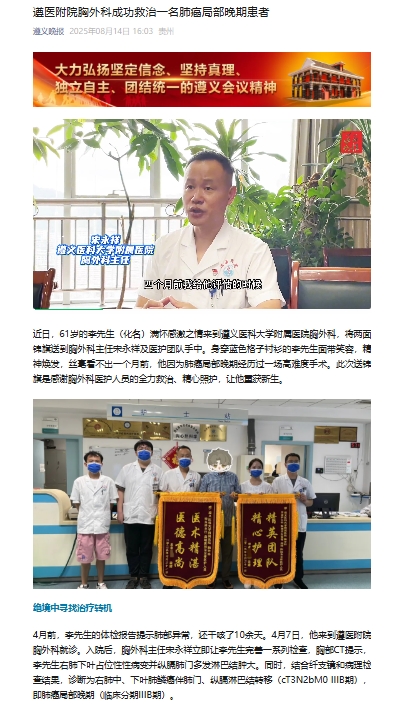 遵义晚报报道 遵医附院胸外科成功救治一名肺癌局部晚期患者