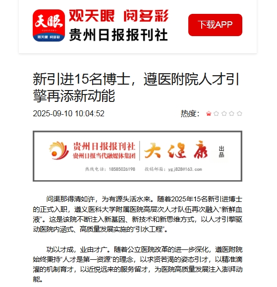 天眼新闻报道 新引进15名博士,遵医附院人才引擎再添新动能