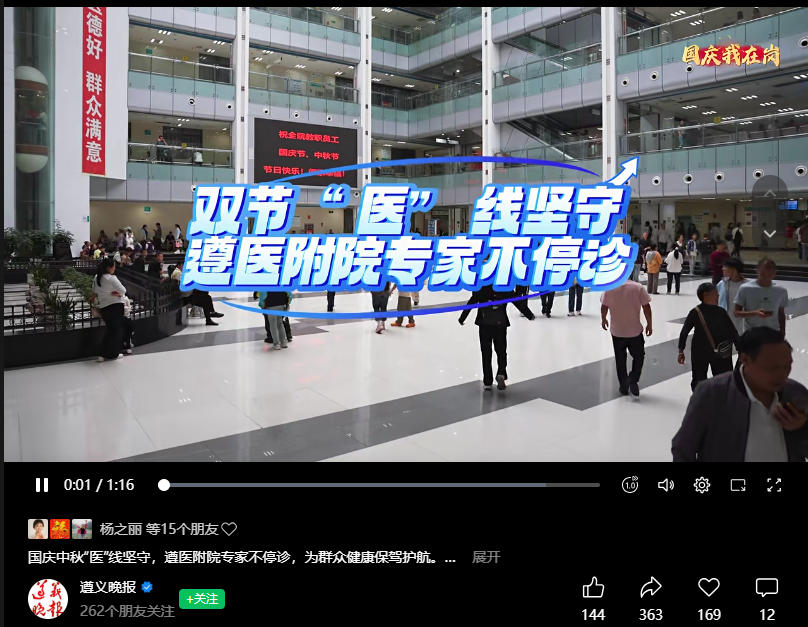 遵义晚报视频号报道 国庆中秋“医”线坚守,遵医附院专家不停诊,为群众健康保驾护航。
