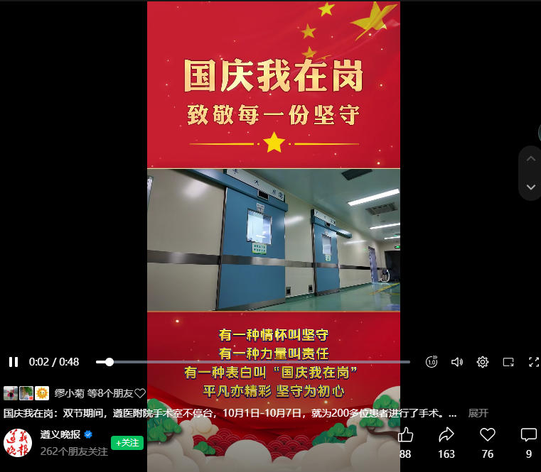 遵义晚报视频号报道 国庆我在岗:双节期间,遵医附院手术室不停台,10月1日-10月7日,就为200多位患者进行了手术。