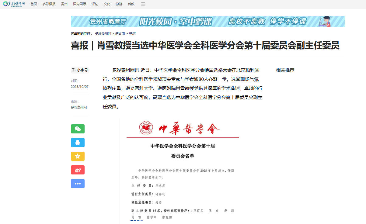 多彩贵州网报道 喜报|肖雪教授当选中华医学会全科医学分会第十届委员会副主任委员