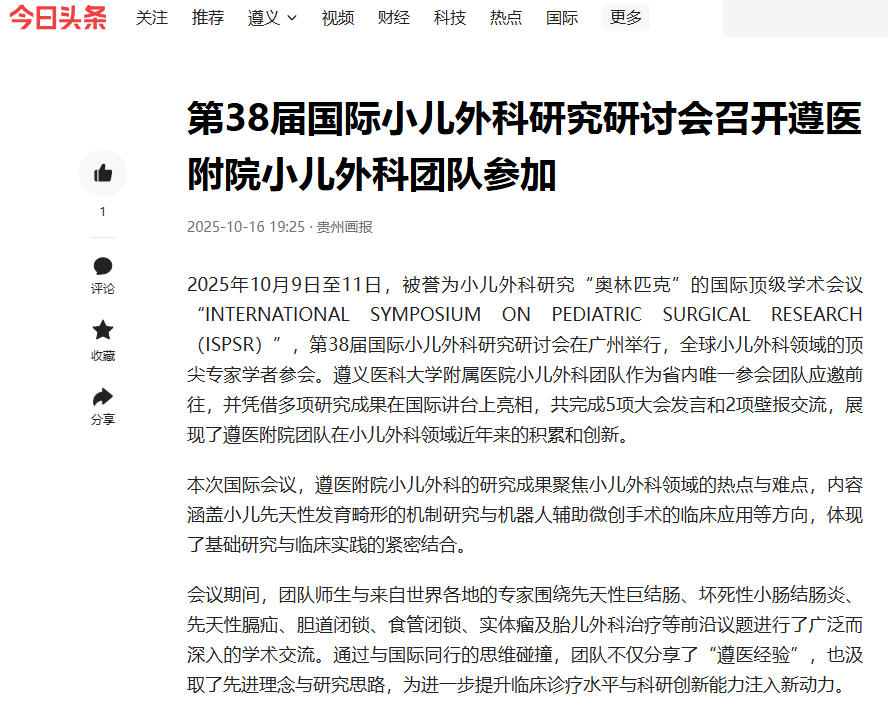 今日头条报道 第38届国际小儿外科研究研讨会召开遵医附院小儿外科团队参加