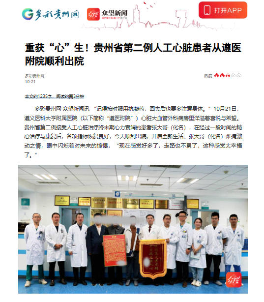 多彩贵州网·众望新闻报道 重获“心”生!贵州省第二例人工心脏患者从遵医附院顺利出院