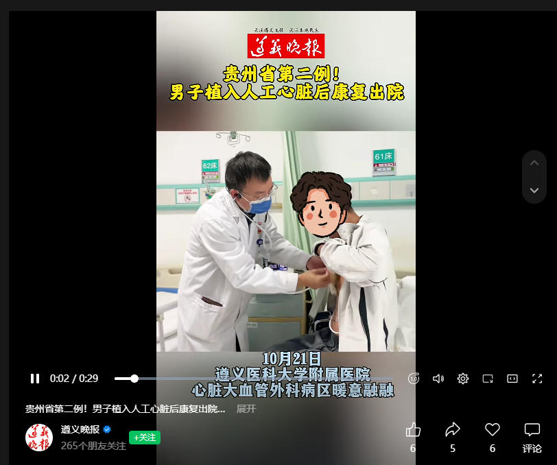 遵义晚报视频号报道 贵州省第二例!男子植入人工心脏后康复出院