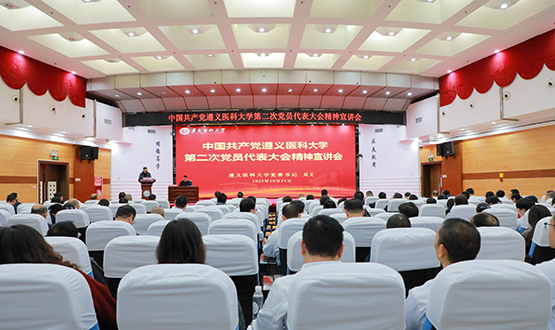 2025年10月21日下午,遵义医科大学党委书记刘文到遵义医科大学附属医院,宣讲中国共产党遵义医科大学第二次党员代表大会精神,他要求附属医院各级党组织、领导干部必须切实增强政治意识、大局意识和责任意识,把思想和行动统一到党代会精神上来,把学习贯彻党代会精神作为当前的重点政治任务抓好抓实,迅速掀起学习宣传、贯彻落实党代会精神热潮,以高度的政治自觉积极落实党代会的各项工作部署。遵义医科大学党委副书记、附属医院党委书记曾征主持宣讲会。