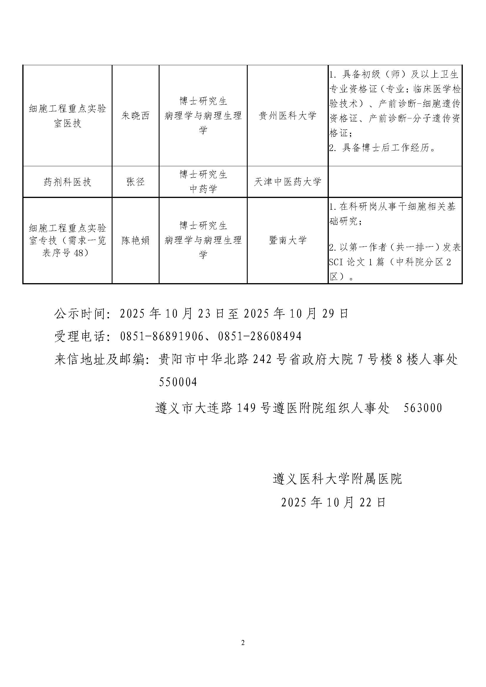 遵义医科大学附属医院2025年第二次简化考试程序招聘博士配偶工作人员拟聘用人员名单公