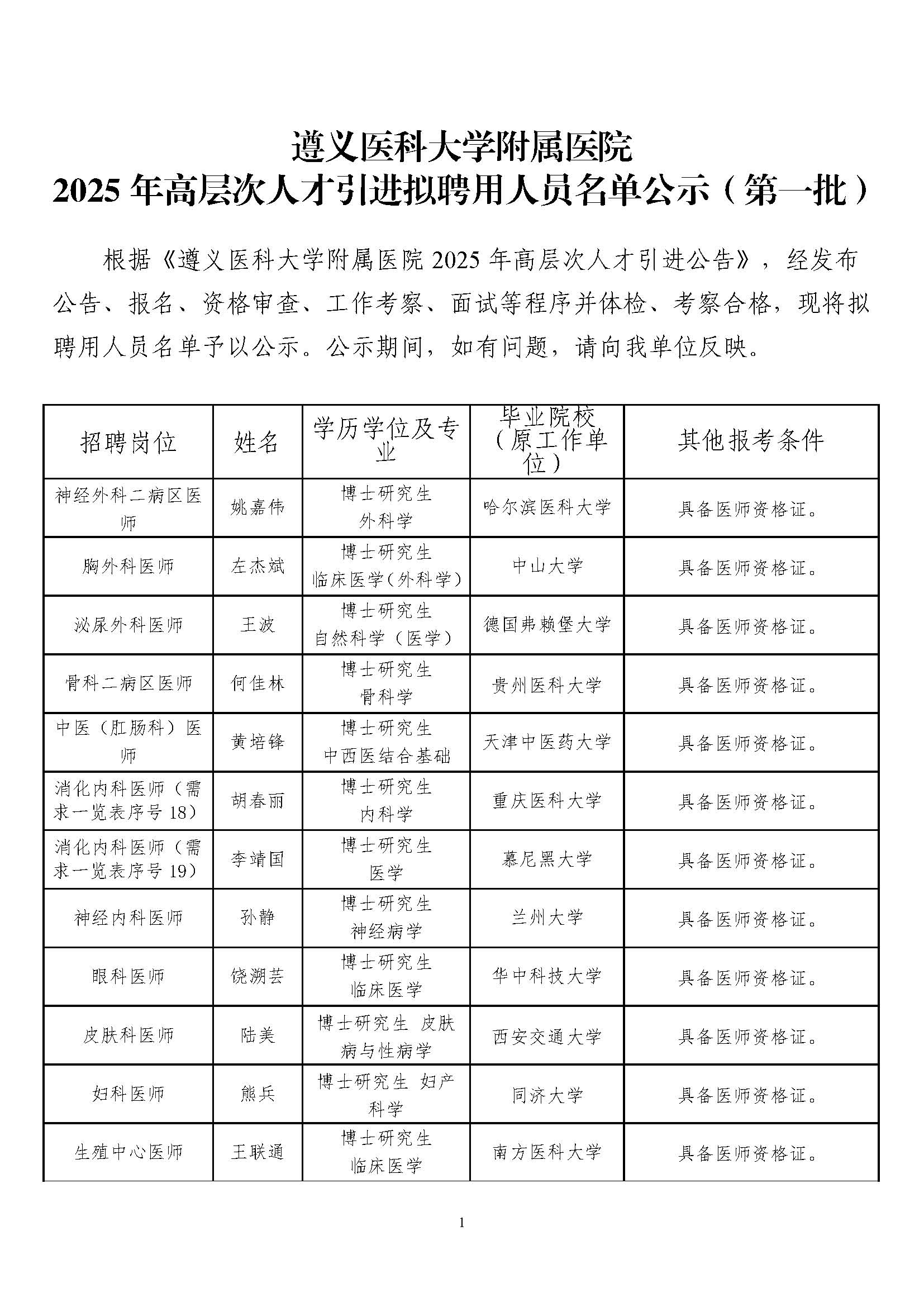 遵义医科大学附属医院2025年高层次人才引进拟聘用人员名单公示(第一批)