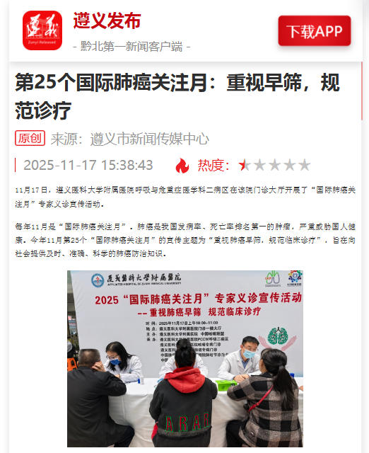 遵义发布报道 第25个国际肺癌关注月:重视早筛,规范诊疗