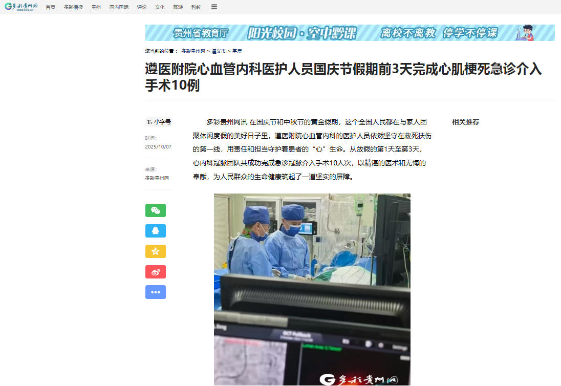 多彩贵州网报道 遵医附院心血管内科医护人员国庆节假期前3天完成心肌梗死急诊介入手术10例