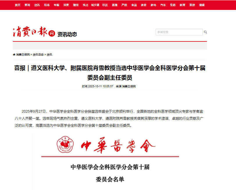 消费日报报道 遵义医科大学、附属医院肖雪教授当选中华医学会全科医学分会第十届委员会副主任委员