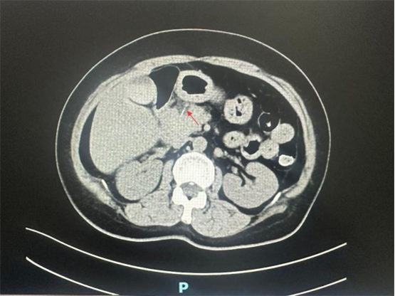 腹部CT显示胃窦水平与胰腺之间细条形高密度影,异物?胆汁淤积或泥沙样结石,遂转入肝胆外科继续治疗,继续胃肠减压,针对胃窦水平与胰腺之间异物,追踪病史10+天前误吞鱼刺,进一步行超声内镜,十二指肠及胃腔未发现异物,异物可能由胃腔穿入胰腺组织,也可能由十二指肠穿入胰腺组织,经全科讨论认为异物已经十二指肠壁进入胰腺,异物远端离肠系膜上静脉非常近,如不及时取出异物,有穿破肠系膜上静脉引起大出血风险。经消化内科会诊排除内镜取出的可能性,只有进行外科手术探查。在积极完善术前准备后进行手术治疗,为减少创伤,首选腹腔镜微创手术探查。