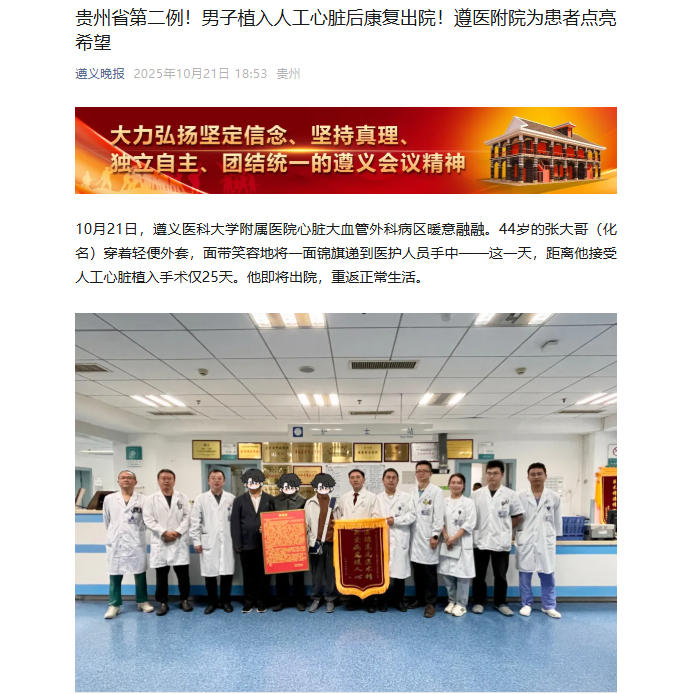 遵义晚报报道 贵州省第二例!男子植入人工心脏后康复出院!遵医附院为患者点亮希望