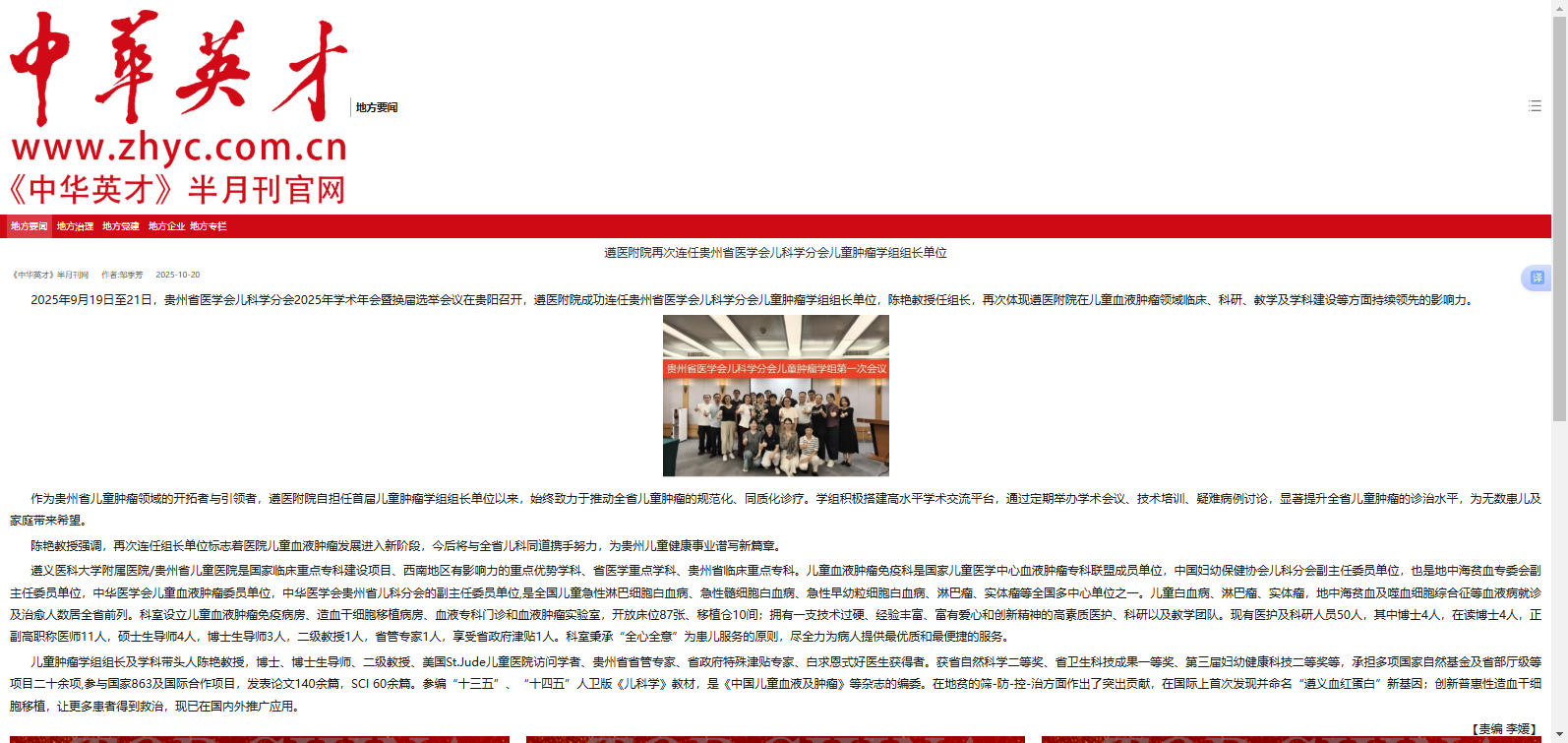 《中华英才》半月刊网报道 遵医附院再次连任贵州省医学会儿科学分会儿童肿瘤学组组长单位