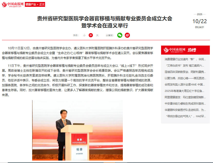 中国商报网报道 贵州省研究型医院学会器官移植与捐献专业委员会成立大会暨学术会在遵义举行