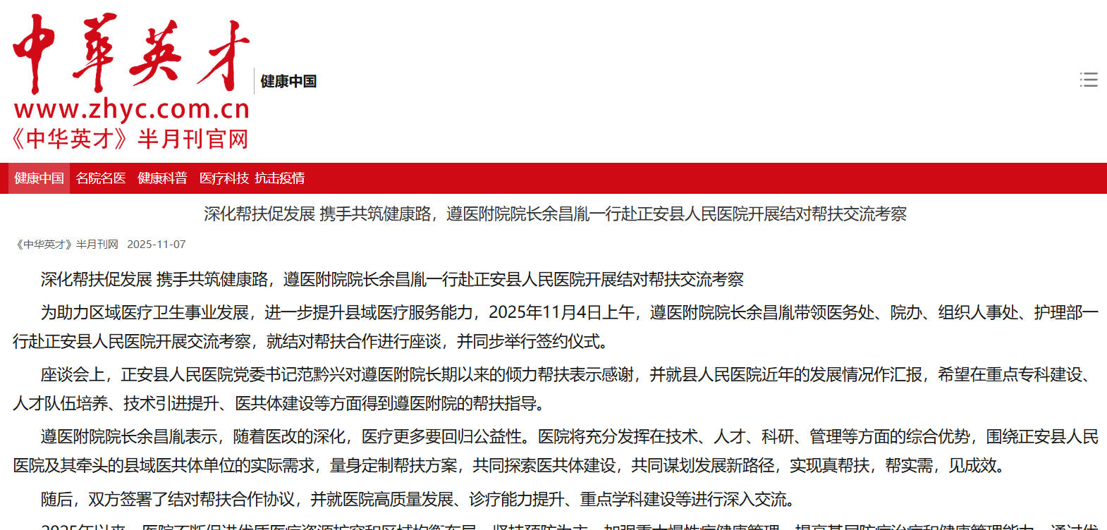 《中华英才》半月刊网报道 深化帮扶促发展 携手共筑健康路,遵医附院院长余昌胤一行赴正安县人民医院开展结对帮扶交流考察