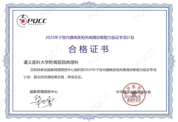 近日,国家病理质控中心公布了“ 2025年子宫内膜相关病变、肺癌病理诊断能力专项计划及弹力纤维染色等项目检测合格”名单,遵医附院病理科成功通过考核,充分体现了病理科建设成果、规范化检验流程、严格的质量控制和过硬的病理诊断能力,标志着病理科子宫内膜相关病变、肺癌病理诊断能力已与国内各大中心达到同质化水平。