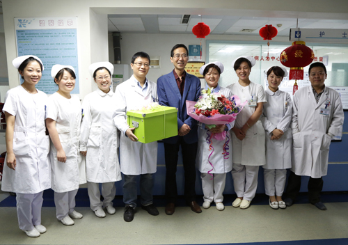 慰问小组一行分别来到肝胆胰外科、呼吸内科等护理单元,亲切看望坚守在护理工作岗位上的护士们,将节日礼物亲自送到护士们的手中,祝她们节日快乐,并与科室的护士代表们合影留念。