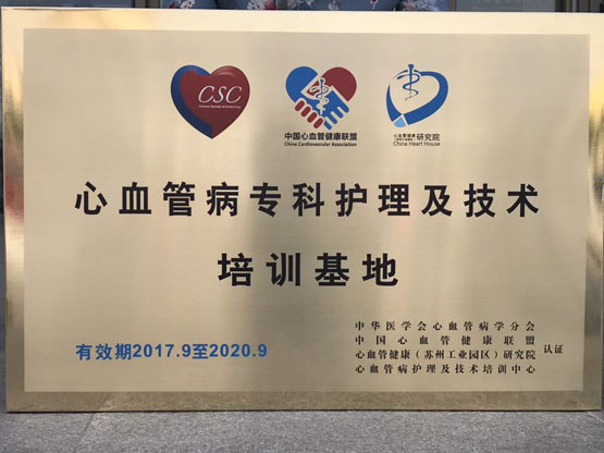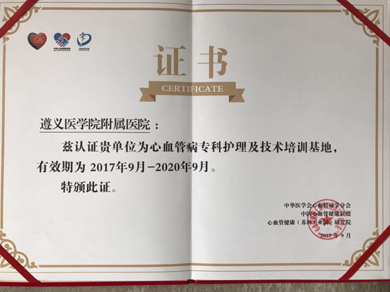 2017年9月17日,中华医学会第十九次全国心血管年会在山西太原召开。会上,中华医学会心血管学分会、中国心血管健康联盟、心血管健康研究院公布了2017年首批“心血管病专科护理及技术培训基地”并举行了授牌仪式。遵医附院心内科成为全国首批心血管病护理及技术培训基地,遵医附院心内科护士长杨文笔领取牌匾。